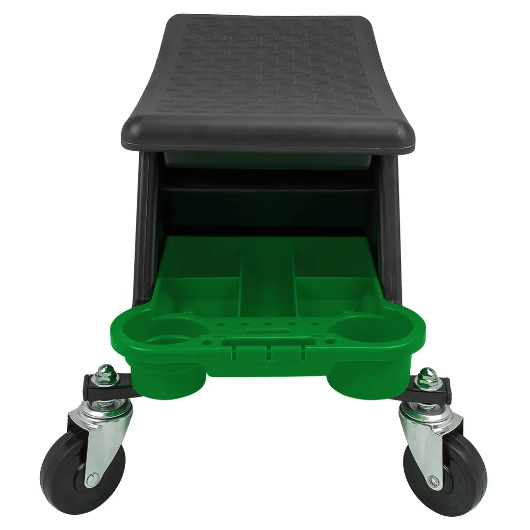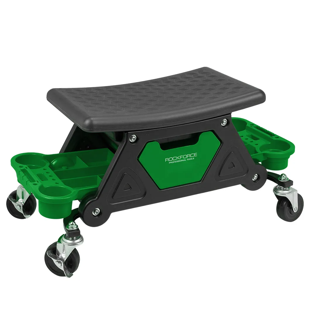 Стул пластиковый передвижной разработан для мастерских, автомастерских, СТО, гаражей, личного использования. Удобное сиденье изогнутой формы. Комфорт при выполнении долгих и сложных работ. Комплектуется ложементом и выдвижным ящиком для хранения инструментов и запчастей - все необходимое всегда под рукой. Качественное и комфортное место для выполнения работ в сидячем положении. Хорошая маневренность стула за счет поворотных колес на подшипниках. Фиксатор - тормоз на паре колес. Максимальная нагрузка до 130 кг.