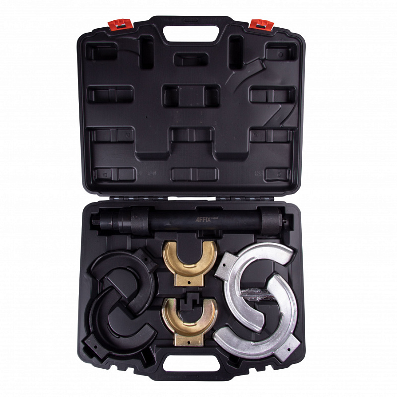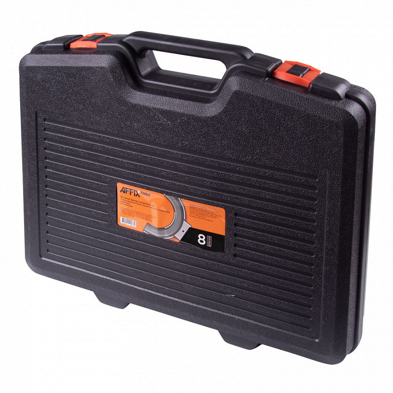 Стяжка амортизаторных пружин AFFIX кованые U-образные держатели, кейс 8 предметов AF10000008C предназначена для сжатия и фиксации в сжатом состоянии пружин подвески автомобиля типа MACPHERSON при ее обслуживании. Применение по маркам BMW, TOYOTA, FORD, MITSUBISHI, VW, AUDI, SAAB, NISSAN, HONDA, SUBARU, VOLVO, OPEL, PORSHE, и др.