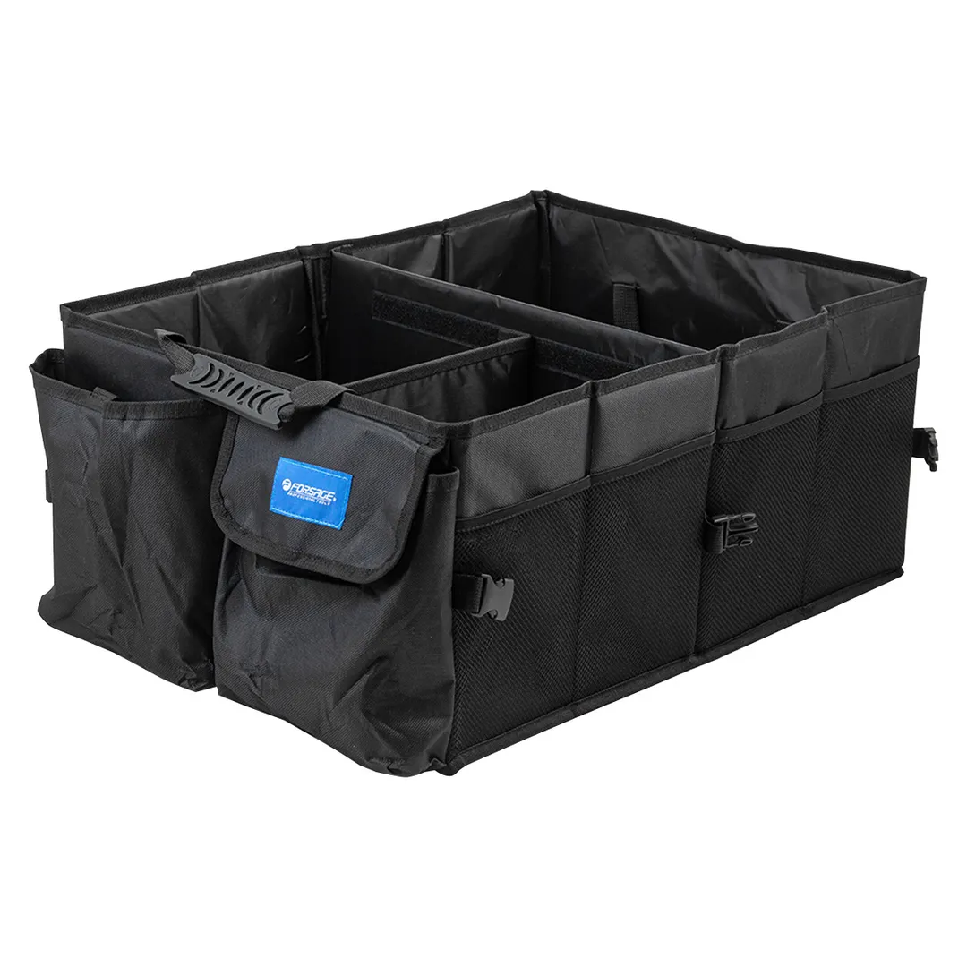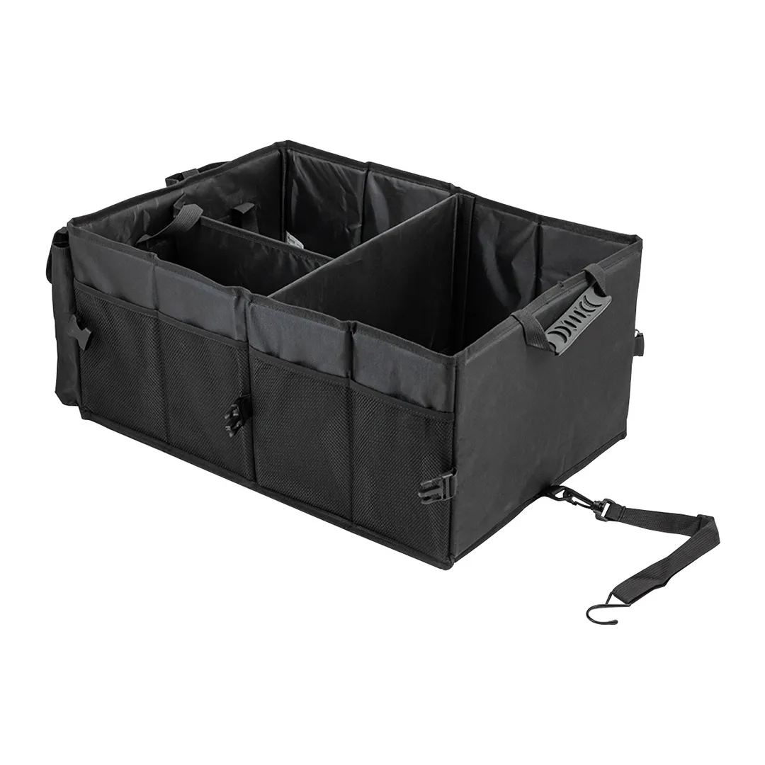 Вместительная сумка-органайзер подходит для хранения авто аксессуаров, инструмента и разных мелочей, таких как аптечка, кабели, зарядные устройства и многое другое. Она имеет размеры 590х430х270 мм и складную конструкцию, что позволяет использовать ее в багажнике, салоне или в гараже.