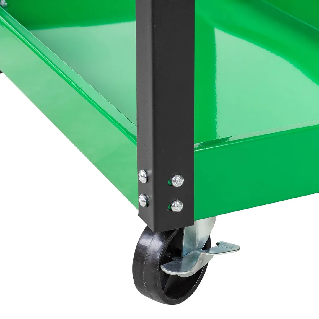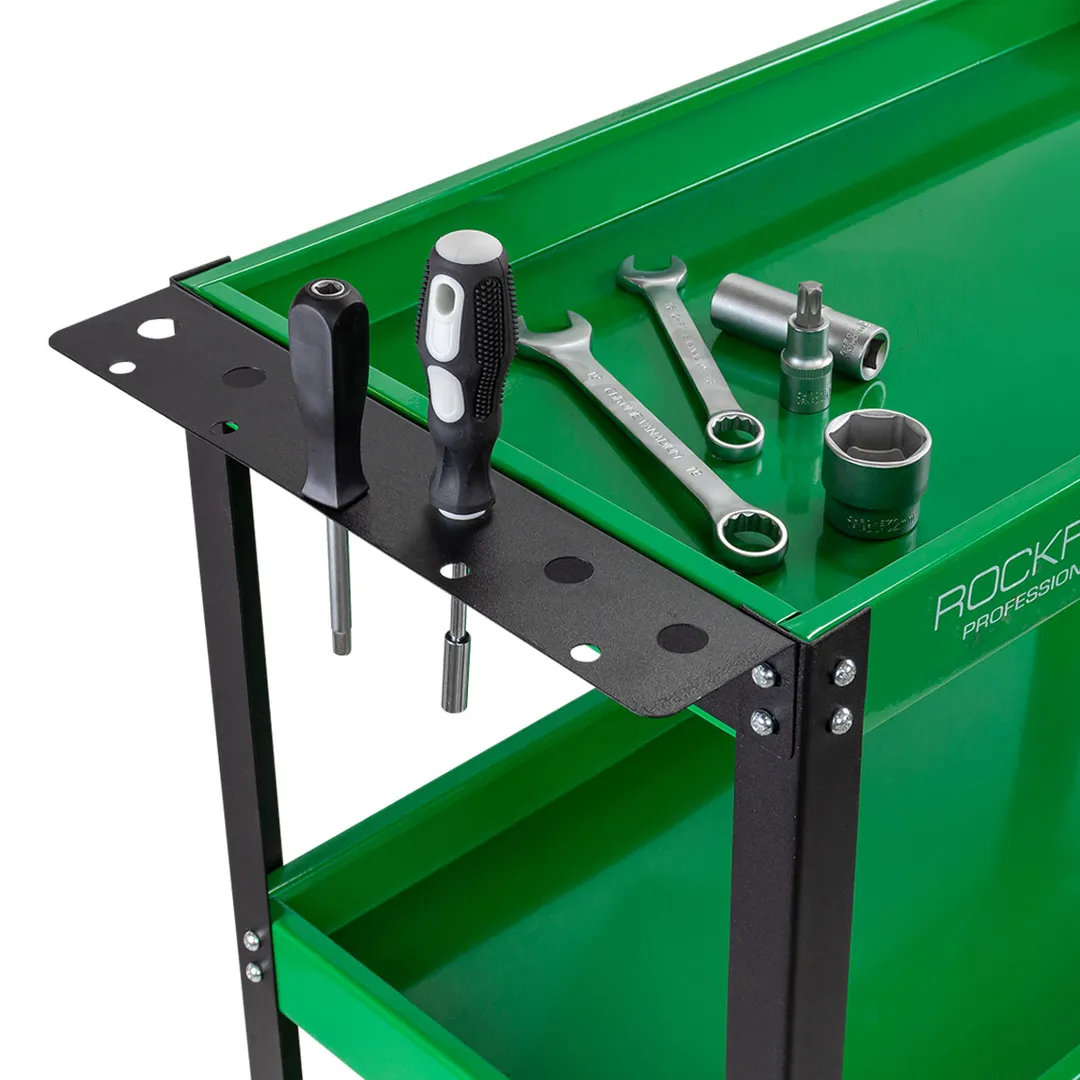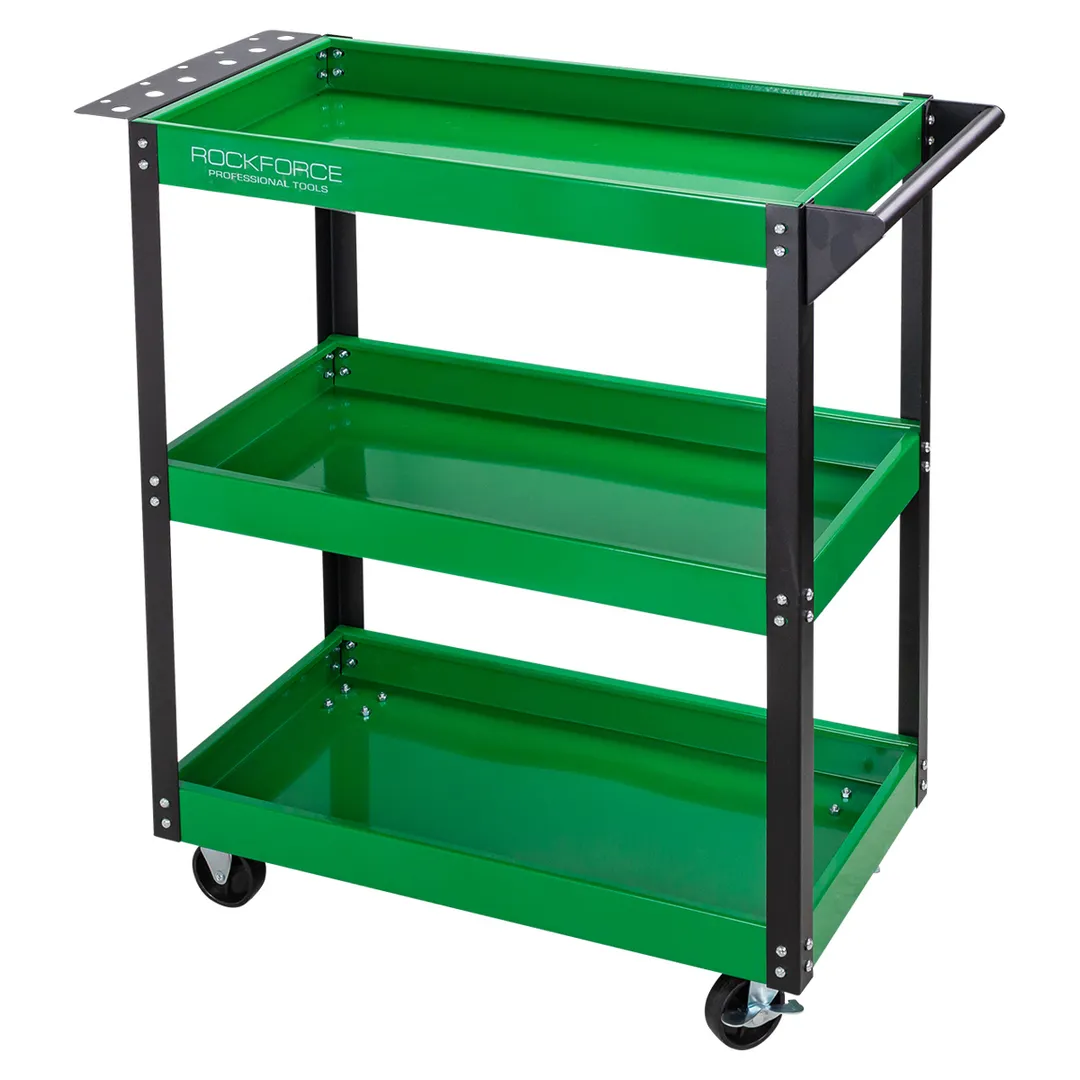 Тележка инструментальная металлическая ROCKFORCE 3-х полочная, модель RF-1141343B — это профессиональное мобильное решение для организации и транспортировки инструмента в условиях автосервисов и производственных мастерских. Тележка изготовлена из высокопрочной стали с порошковым антикоррозионным покрытием, обеспечивающим устойчивость к механическим повреждениям и воздействию технических жидкостей. Конструкция включает три полки с дифференцированной грузоподъемностью: нижняя полка выдерживает до 60 кг, средняя — 45 кг, верхняя — 30 кг, что позволяет рационально распределять инструмент и оборудование по весу. Тележка оснащена четырьмя колесами с двумя поворотными парами для маневренности, включая колеса с тормозной системой для фиксации положения. Габаритные размеры 720×350×780 мм оптимизированы для работы в ограниченном пространстве.