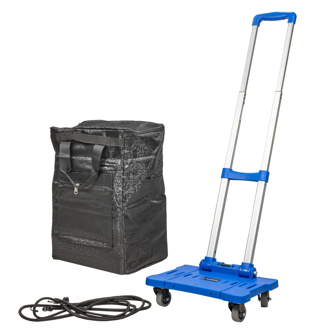 Тележка платформенная складная г/п 50кг с сумкой 440х300х200мм и телескопической ручкой+набор эластичных шнуров. Размер в разложенном виде:41х23х97см, в сложенном:39х33х14см. Тележка транспортировочная грузоподъемностью 50кг. Складная ручная тележка оснащена 4 поворотными на 360 градусов колесами: тихие и износостойкие колеса значительно улучшают маневренность и устойчивость складной тележки. Регулируемая высота рукоятки: тележка имеет эргономичную ручку. Нажмите кнопку на ручке, чтобы отрегулировать высоту. Противоскользящее покрытие стабилизирует товар при транспортировке. Раздвижная конструкция платформы - увеличивает площадь. Высокопрочная опорная площадка из полипропилена обладает высокой несущей способностью. Максимальная грузоподъемность 50кг. В комплекте шнур 1,5 метра с крюками для фиксации груза. Тележка - инструмент для транспортировки сумок и груза при совершении крупных покупок, путешествий, переездов, погрузочно-разгрузочных работ, складских операций, садоводства и т. д. Отличный помощник на раб