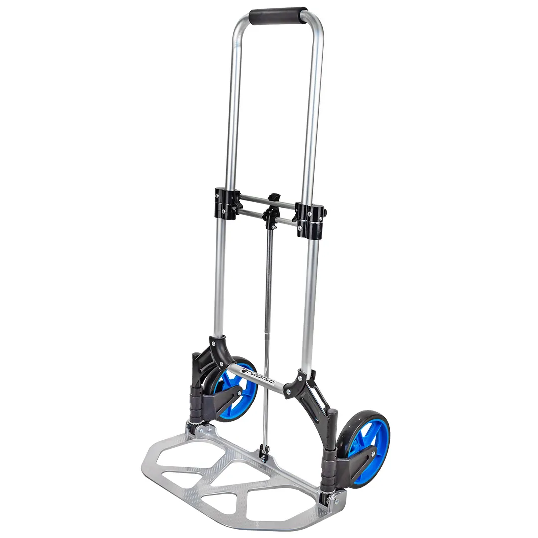 Тележка ручная складная двухколесная с телескопической ручкой г/п 70 кг представляет собой изделие с небольшой платформой, расположенной относительно стойки под углом 90 градусов. За счет небольших габаритов обладает высокой степенью маневренности. Опорная стойка тележки переходит в удобную телескопическую ручку, которая регулируется простым нажатием кнопки. Во время перевозки груза тележка наклоняется к пользователю под углом 45 градусов, что позволяет равномерно распределить нагрузку и без труда перевозить все что вам нужно. используется для перевозки небольших грузов и ручной клади и рассчитана на рабочую нагрузку до 70 кг. Тележка оснащена откидной платформой 255×480 мм, которая имеет противоскользящее рифленое покрытие для стабилизации товара при транспортировке. Тележка- тачка дорожная снабжена двумя мощными колесиками с эластичным покрытием диаметром 175 мм, что обеспечивают плавный зод и бесшумное движение, а также позволяют с легкостью передвигаться по бездорожью, даже в зимний период, и в непогоду.