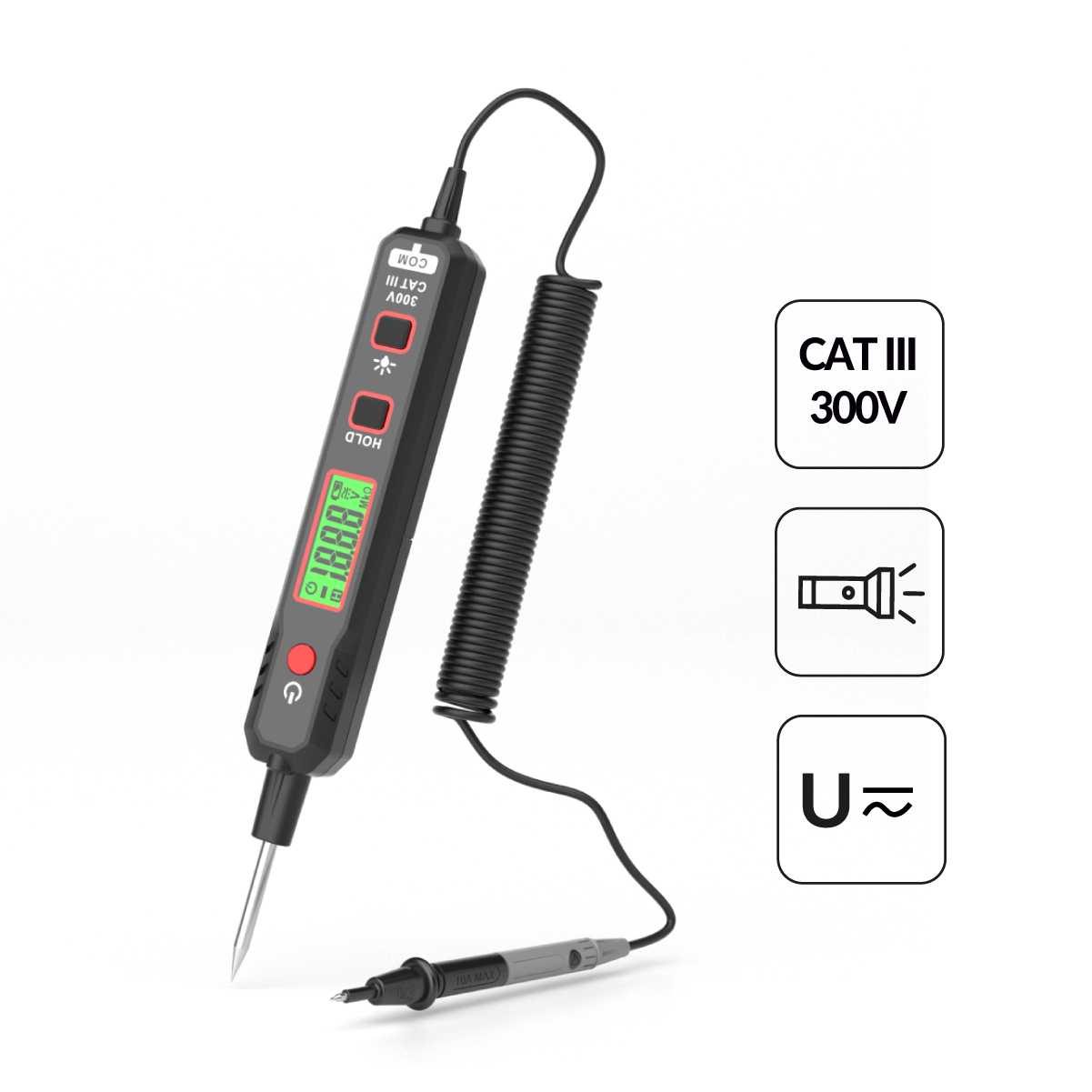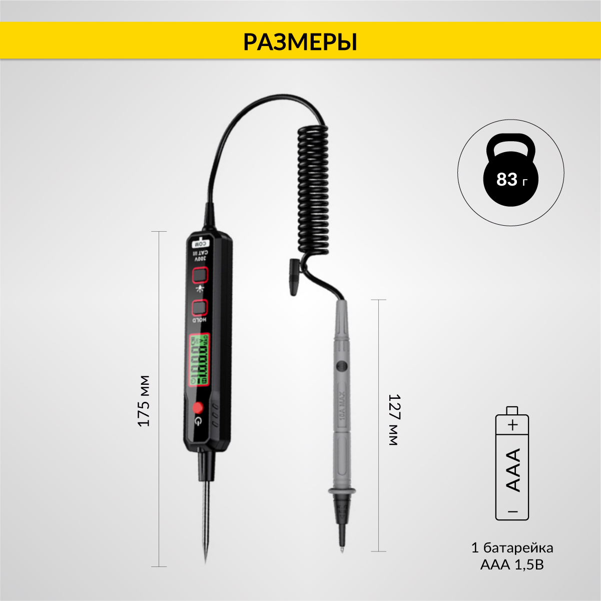 Тестер выполнен из ударопрочного ABS-пластика, имеет ЖК-дисплей с подсветкой, фонарик, металлический щуп и спиральный провод с выносным щупом.