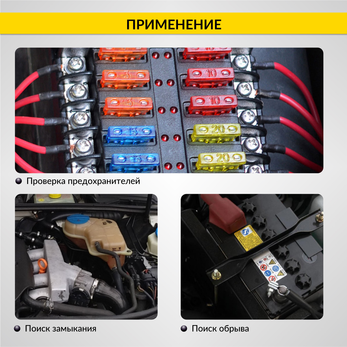 С помощью тестера вы сможете проверить неисправные предохранители и лампы, определить полярность напряжения (+/-), выявить замыкание и обрыв проводки, замерить напряжение и сопротивление.