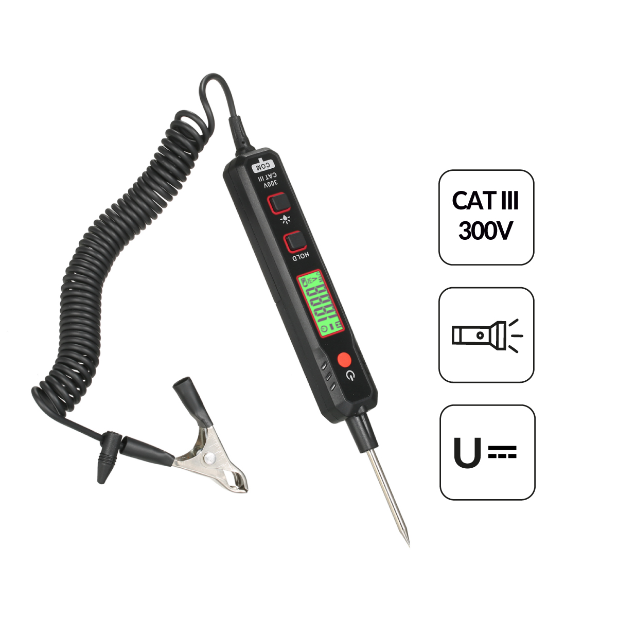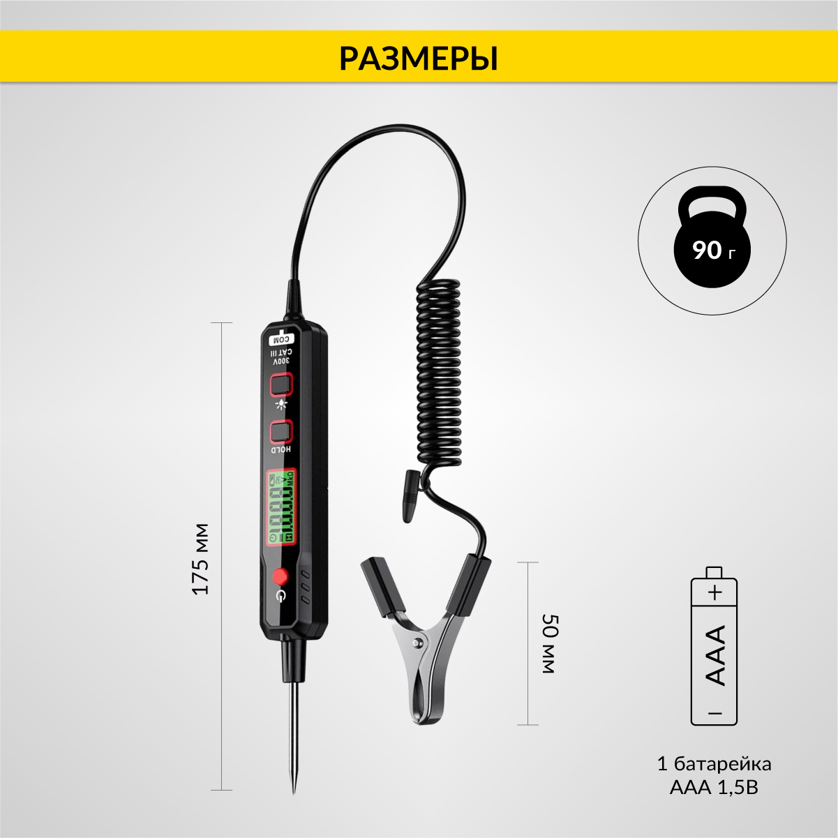 Тестер выполнен из ударопрочного ABS-пластика, имеет ЖК-дисплей с подсветкой, фонарик, металлический щуп и спиральный провод с зажимом типа «крокодил».