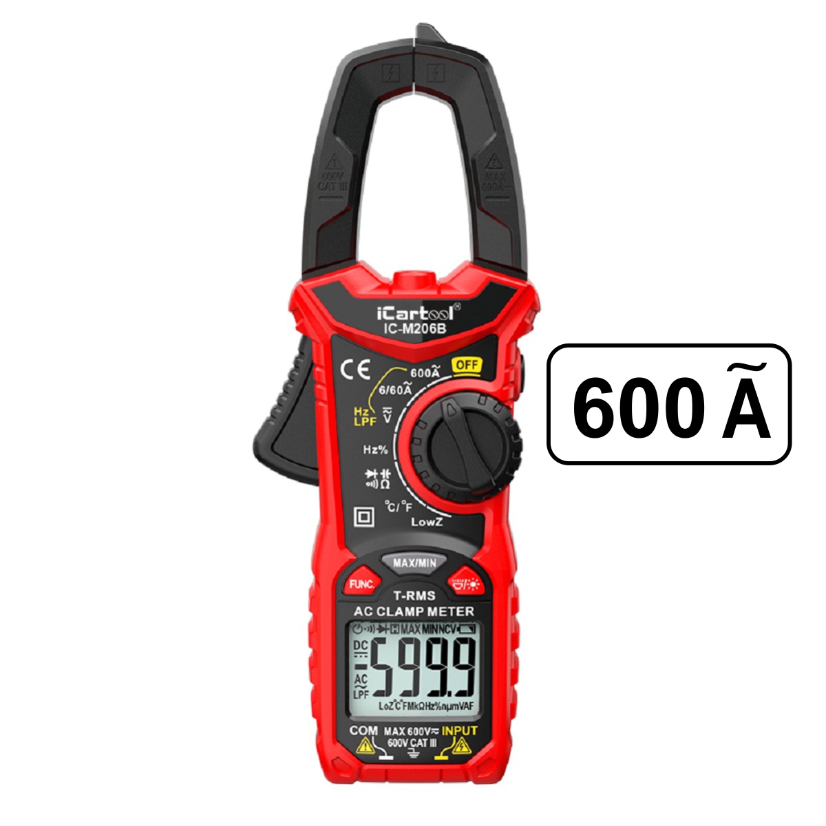 IC-M206B – высокочувствительные цифровые токоизмерительные клещи с функцией мультиметра. Устройство имеет широкий функционал: измерение переменного тока, сопротивления, емкости, постоянного/переменного напряжения, даже при низком сопротивлении (функция LowZ) и многое другое. С помощью этих клещей вы сможете бесконтактно определить напряжение проверить целостность цепи. Прибор демонстрирует максимально точные показания благодаря измерению TrueRMS.
