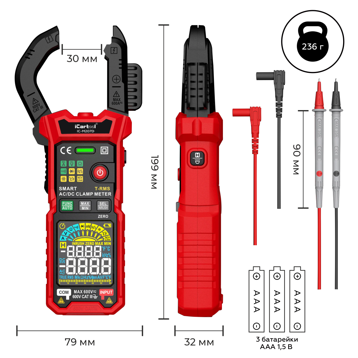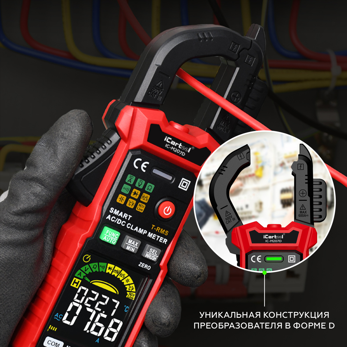 Токовые клещи с режимом смарт iCartool IC-M207D имеют возможность автоматического определения типа сигнала и настройки параметров измерения. SMART-режим максимально удобен при потоковом объеме нескольких замеров (например аппаратуры на производстве) – нет необходимости перед выполнением измерения каждый раз менять функцию – прибор сам выберет необходимый режим из доступных и предотвратит ошибку. Также эти клещи представляют продвинутый мультиметр с возможностью выбора режима работы (ручной/автоматический) и широким набором функций.