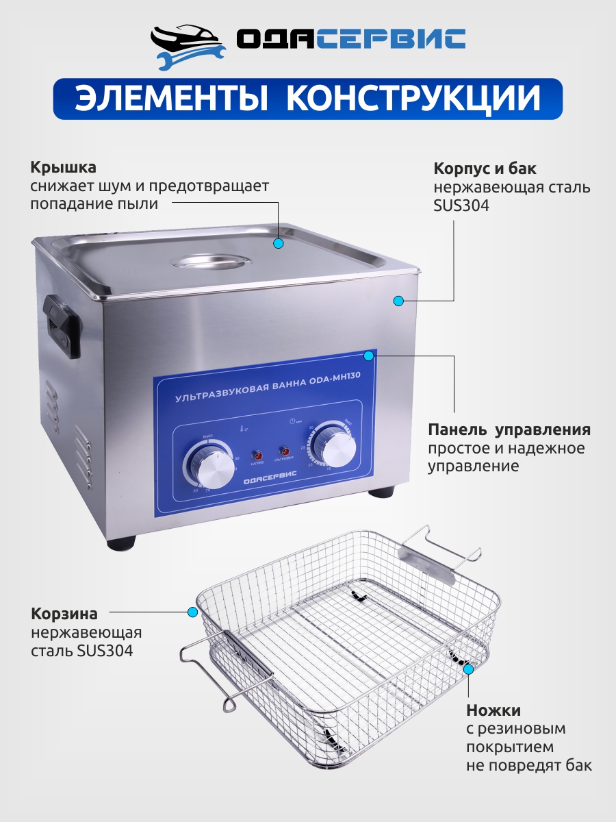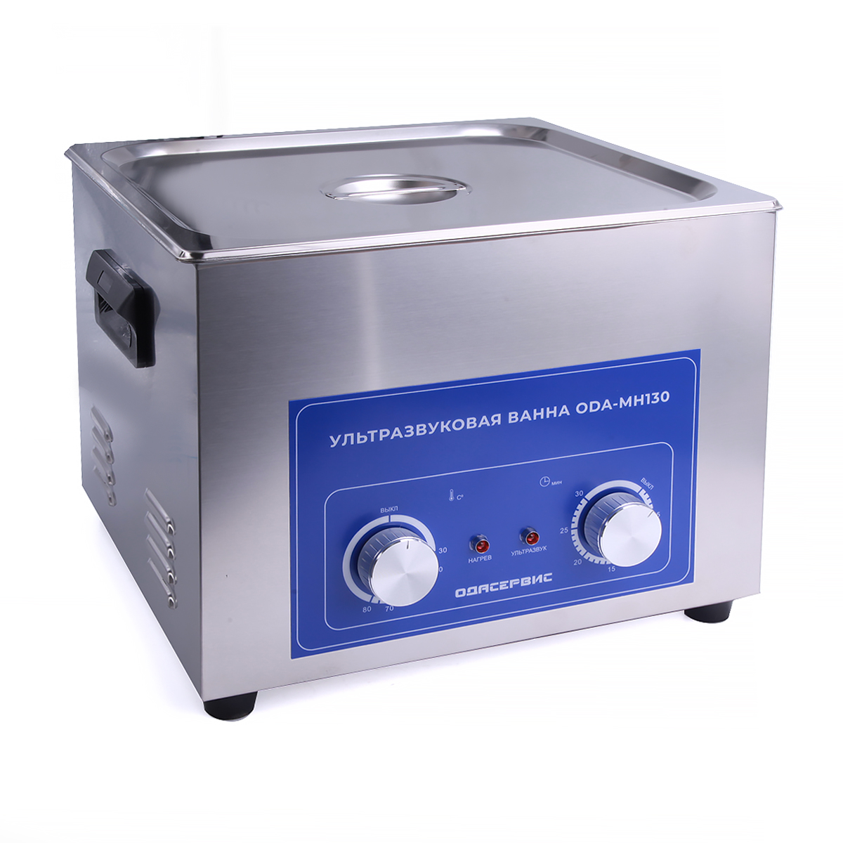ODA-MH130 – ультразвуковая ванна объемом 15 литров с аналоговым управлением. Оснащена механическим таймером до 30 минут и подогревом до 80°С. Ванна и корзина сделаны из нержавеющей стали SUS304. Имеет частоту ультразвука 40кГц. Подходит для очистки маслянистых, смолистых, жировых и карбоновых отложений. Также возможно использование для стерилизации различных предметов.