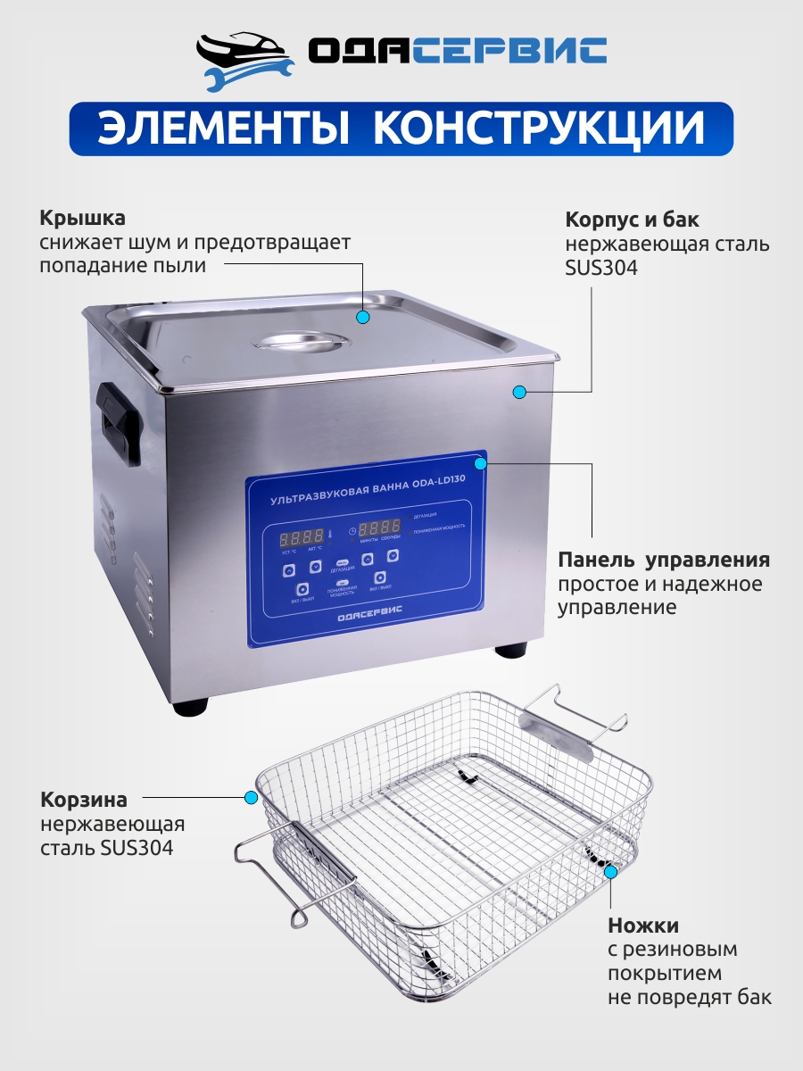 ODA-LD130 – ультразвуковая ванна объемом 15 литров с электронным управлением, дегазацией и выбором мощности ультразвука, 50 или 100%. Оснащена таймером до 30 минут и подогревом до 80°С. Ванна и корзина сделаны из нержавеющей стали SUS304. Имеет частоту ультразвука 40кГц. Подходит для очистки маслянистых, смолистых, жировых и карбоновых отложений. Также возможно использование для стерилизации различных предметов.