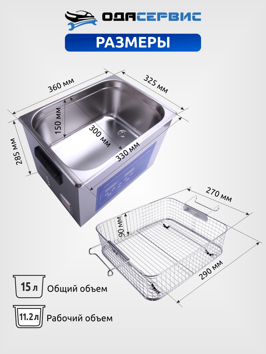 *Обратите внимание: объем ванны указанный в Наименовании, заводом изготовителем, рассчитывается по формуле ДхШхГ, где Д (длина) и Ш (ширина) измеряются по верхней внутренней границе бака, Г ( глубина) максимальное расстояние от верхней кромки бака до его дна. Реальный объем ванны в литрах, отличаться от заявленного, т.к. конструкция бака конусообразная. При выборе ультразвуковой ванны ориентируйтесь на ее рабочий объем.