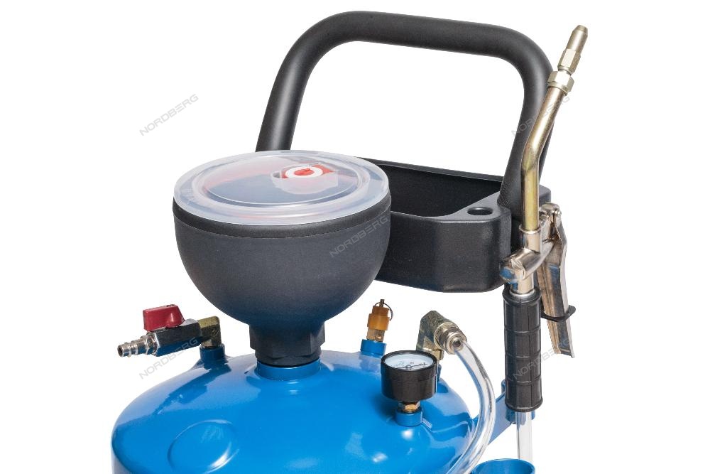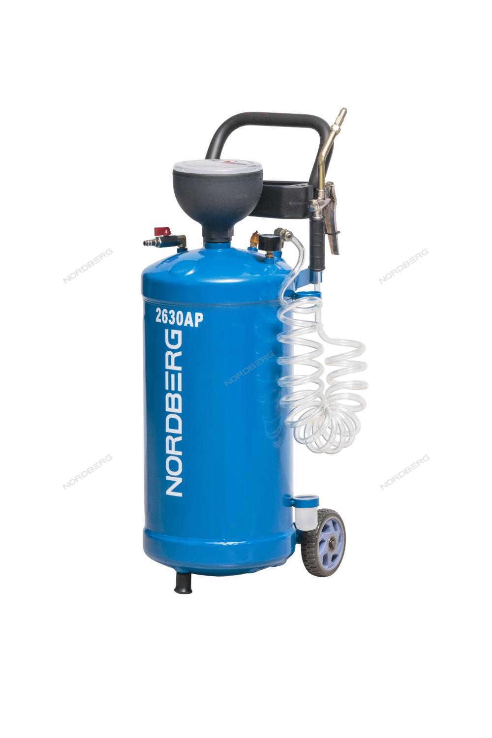 Установка для раздачи масла NORDBERG AUTOMOTIVE 2630AP стальная емкость объемом 30 л, на колесах для удобства перемещения в помещении автосервиса, оборудована пластиковой воронкой, через которую необходимое для заправки, масло, заливается в емкость, шлангом с маслораздаточным пистолетом, шаровым краном для подключения внешнего источника воздушного давления (компрессор до 10 Атм - поставляется отдельно). Раздача масла осуществляется при подключении внешнего компрессора (поставляется отдельно), через ручной маслораздаточный пистолет.