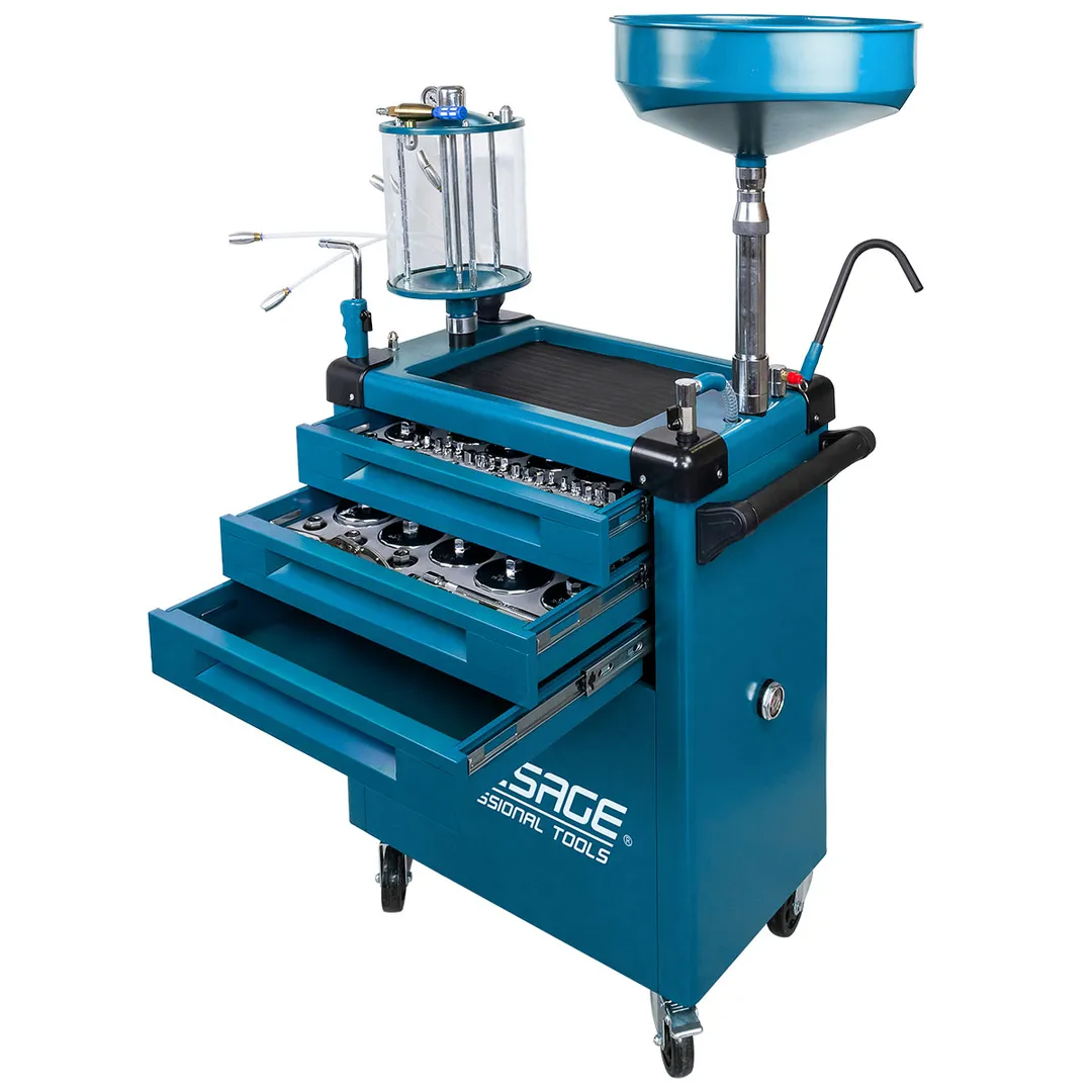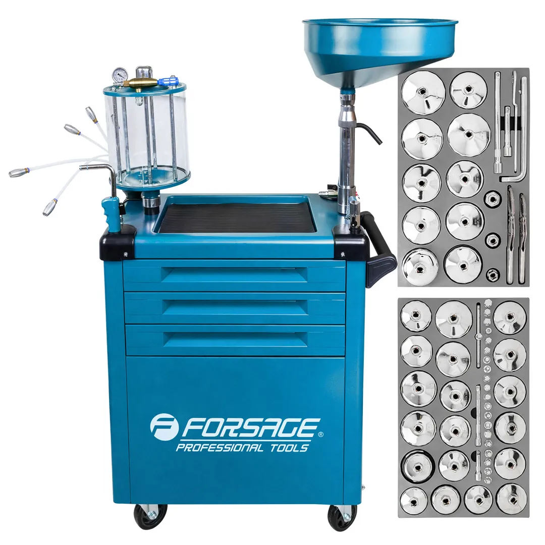 Установка позволяет не только слить традиционным способом отработанное масло, но и произвести более тщательный вакуумный отбор. При подсоединении щупа к отверстию для контроля уровня масла, компрессором и устройством внутри создается разряжение, величина которого такова, что позволяет откачивать масло непосредственно из поддона двигателя или КПП в маслосборный резервуар установки. Вся процедура занимает несколько минут, а благодаря набору быстрозаменяемых откачивающих щупов можно обслужить автомобиль любой модели. Установка также оснащена прозрачной мерной колбой для оценки состояния сливаемого масла. Т.к. в качестве источника энергии для выполнения всех функций, в том числе слив масла из маслобака установки, используется сжатый воздух, что обеспечивает безопасность эксплуатации, экологическую чистоту и низкое энергопотребление. Установка выполнена в виде инстурментального ящика на колесах, что расширяет ее рабочие свойства. Поворотные колеса позволяют легко перемещать установку в рамках рабочей зоны. Кроме т