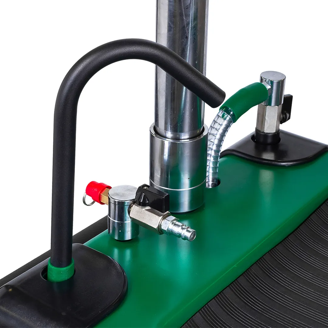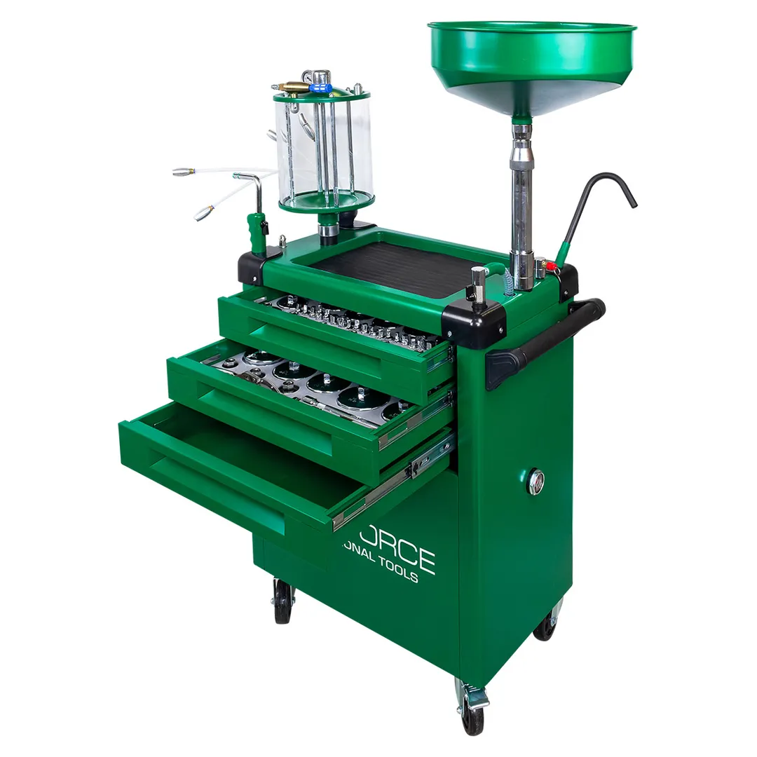 Установка позволяет не только слить традиционным способом отработанное масло, но и произвести более тщательный вакуумный отбор. При подсоединении щупа к отверстию для контроля уровня масла, компрессором и устройством внутри создается разряжение, величина которого такова, что позволяет откачивать масло непосредственно из поддона двигателя или КПП в маслосборный резервуар установки. Вся процедура занимает несколько минут, а благодаря набору быстрозаменяемых откачивающих щупов можно обслужить автомобиль любой модели. Установка также оснащена прозрачной мерной колбой для оценки состояния сливаемого масла. Т.к. в качестве источника энергии для выполнения всех функций, в том числе слив масла из маслобака установки, используется сжатый воздух, что обеспечивает безопасность эксплуатации, экологическую чистоту и низкое энергопотребление. Установка выполнена в виде инстурментального ящика на колесах, что расширяет ее рабочие свойства. Поворотные колеса позволяют легко перемещать установку в рамках рабочей зоны. Кроме т