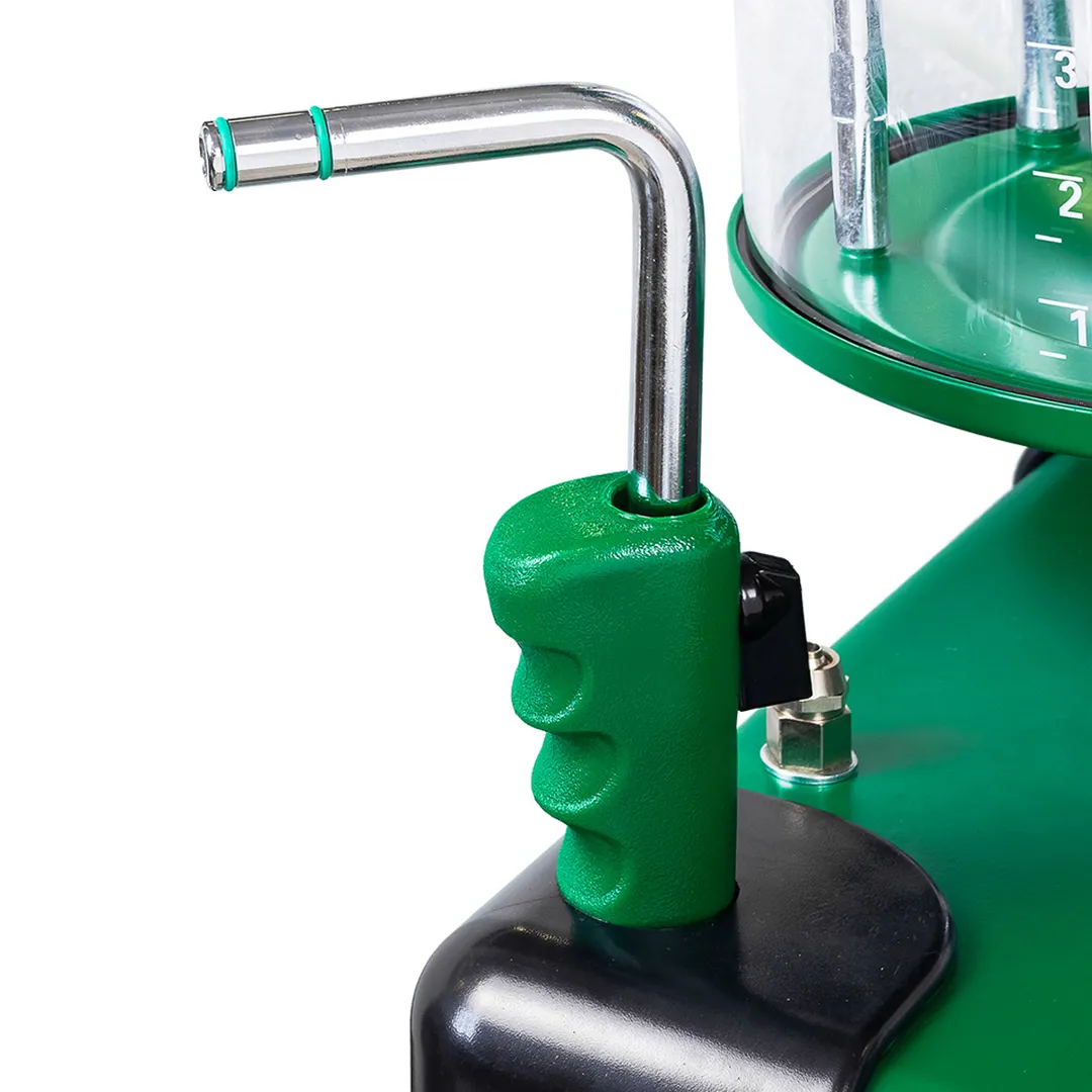 Установка позволяет не только слить традиционным способом отработанное масло, но и произвести более тщательный вакуумный отбор. При подсоединении щупа к отверстию для контроля уровня масла, компрессором и устройством внутри создается разряжение, величина которого такова, что позволяет откачивать масло непосредственно из поддона двигателя или КПП в маслосборный резервуар установки. Вся процедура занимает несколько минут, а благодаря набору быстрозаменяемых откачивающих щупов можно обслужить автомобиль любой модели. Установка также оснащена прозрачной мерной колбой для оценки состояния сливаемого масла. Т.к. в качестве источника энергии для выполнения всех функций, в том числе слив масла из маслобака установки, используется сжатый воздух, что обеспечивает безопасность эксплуатации, экологическую чистоту и низкое энергопотребление. Установка выполнена в виде инстурментального ящика на колесах, что расширяет ее рабочие свойства. Поворотные колеса позволяют легко перемещать установку в рамках рабочей зоны. Кроме т