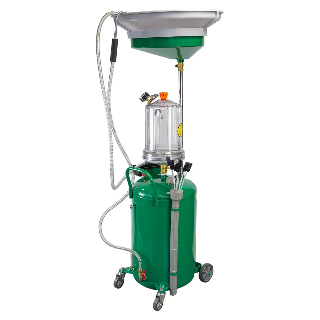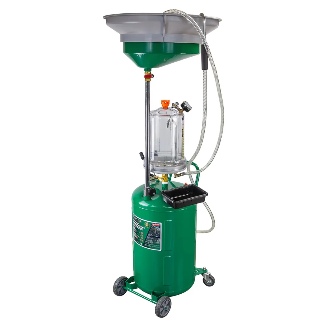 Установка пневматическая для сбора отработанного масла 80л - представляет из себя вакуумное устройство, выполняющее откачку и сбор отработанных масел. Встроенная мерная колба 10 л обеспечивает точный контроль объема слитого масла. Осмотровая колба позволяет визуально оценить качество отработанного масла и имеющиеся недостатки двигателя. Широкая воронка 10 л служит для удобного сбора без проливов и брызг. Регулируемая воронка устанавливается на необходимой для работы высоте при помощи прижимного винта. Конструкция устройства обеспечивает быстрый и аккуратный отбор масла из двигателя при помощи точно подобранного по размеру щупа. Защищена от переполнения благодаря наличию индикатора загрузки бака. Обеспечивает максимальное давление вакуума в пределах 8-10 кг/см². Эффективная работа от стандартной пневмолинии. Используется как сливное устройство со свободным сливом отработанного масла из двигателей, коробок передач и дифференциалов всех транспортных средств. ОБРАТИТЕ ВНИМАНИЕ, ЧТО ДАННЫЙ ТОВАР ДОЛЖЕН ПОСТАВЛЯТЬС
