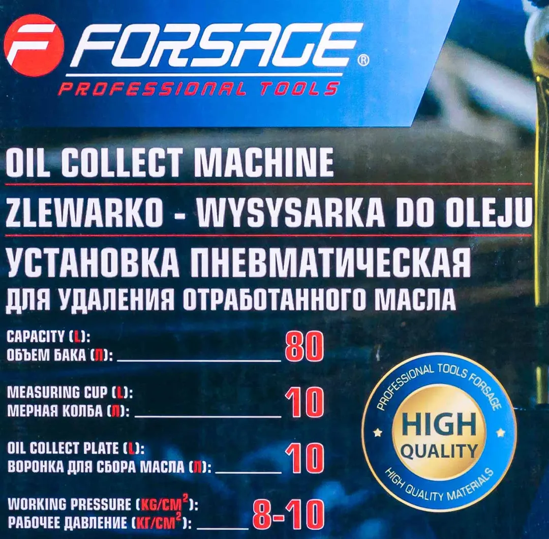 Пневматическая установка для сбора масла предназначена для удаления отработанного масла и других жидкостей из любого транспортного средства при помощи вентури-вакуумной вытяжной системы или свободным сливом. Используется как сливное устройство со свободным сливом отработанного масла из двигателей, коробок передач и дифференциалов всех транспортных средств. Установка портативна и проста в эксплуатации. Включает 5 щупов (3 гибких и 2 жестких) для извлечения жидкости через отверстие щупа контроля уровня масла автомобиля. Регулируемая воронка для сбора масла может быть установлена на необходимой для работы высоте. Оборудование укомплектовано краном в воронке для сбора масла, для контроля состояния сливаемого масла перед началом слива в резервуар. Возможность самоочистки делает работу с устройством чистой и легкой. Осмотровая колба позволяет визуально оценить качество отработанного масла, имеющиеся недостатки двигателя и т.п.