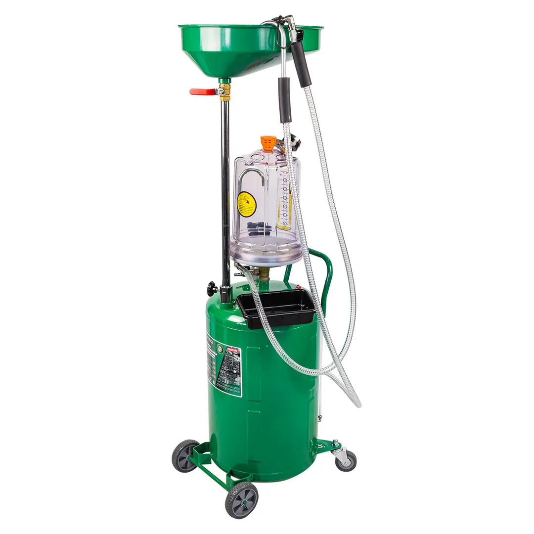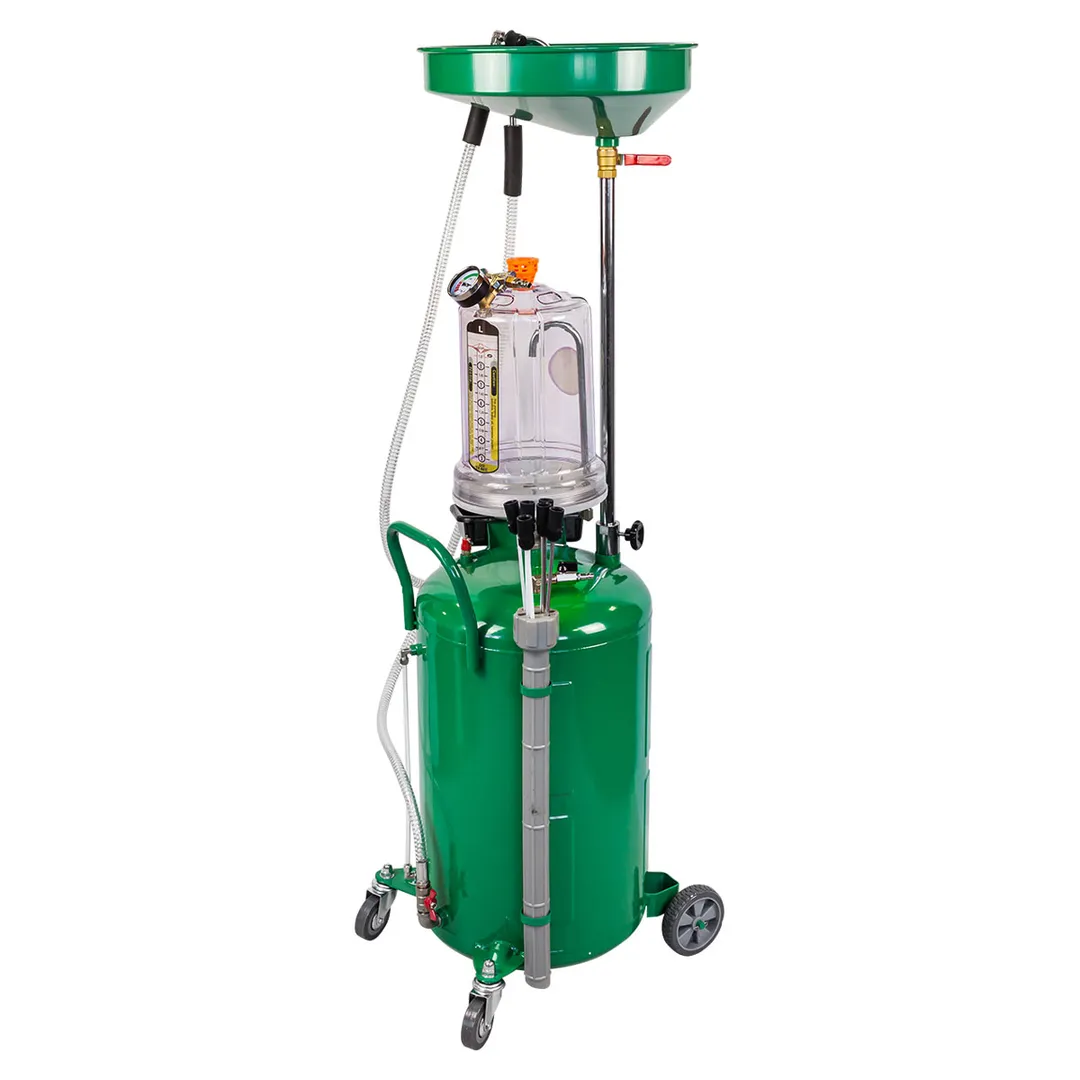 Пневматическая установка для сбора масла предназначена для удаления отработанного масла и других жидкостей из любого транспортного средства при помощи вентури-вакуумной вытяжной системы или свободным сливом. Используется как сливное устройство со свободным сливом отработанного масла из двигателей, коробок передач и дифференциалов всех транспортных средств. Установка портативна и проста в эксплуатации. Включает 5 щупов (3 гибких и 2 жестких) для извлечения жидкости через отверстие щупа контроля уровня масла автомобиля. Регулируемая воронка для сбора масла может быть установлена на необходимой для работы высоте. Оборудование укомплектовано краном в воронке для сбора масла, для контроля состояния сливаемого масла перед началом слива в резервуар. Возможность самоочистки делает работу с устройством чистой и легкой. Осмотровая колба позволяет визуально оценить качество отработанного масла, имеющиеся недостатки двигателя и т.п.