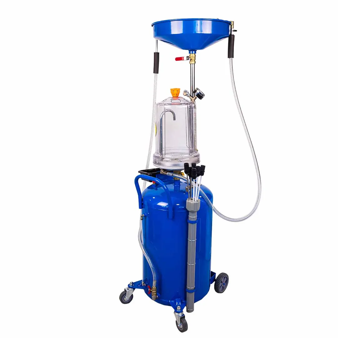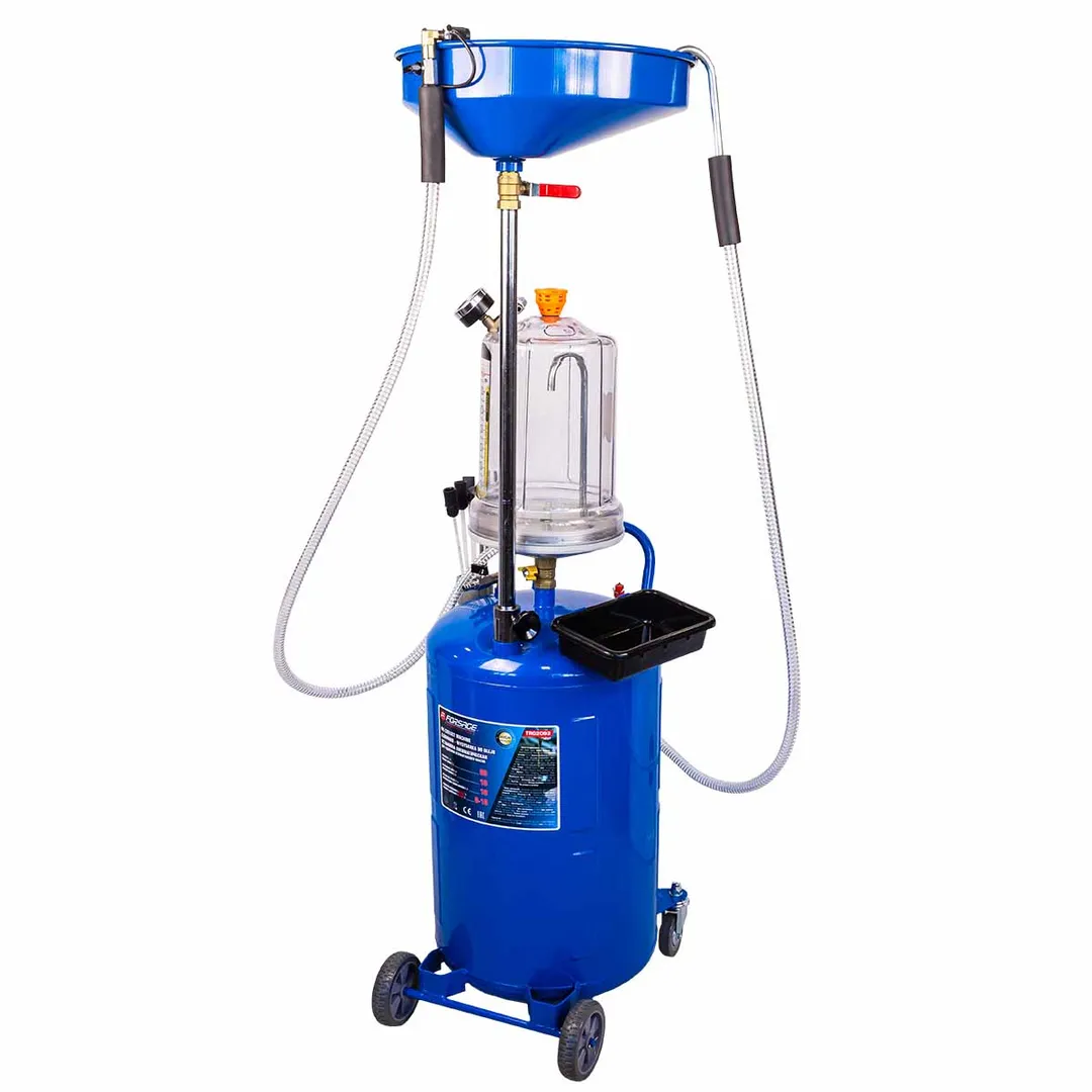 Пневматическая установка для сбора масла предназначена для удаления отработанного масла и других жидкостей из любого транспортного средства при помощи вентури-вакуумной вытяжной системы или свободным сливом. Используется как сливное устройство со свободным сливом отработанного масла из двигателей, коробок передач и дифференциалов всех транспортных средств. Установка портативна и проста в эксплуатации. Включает 5 щупов (3 гибких и 2 жестких) для извлечения жидкости через отверстие щупа контроля уровня масла автомобиля. Регулируемая воронка для сбора масла может быть установлена на необходимой для работы высоте. Оборудование укомплектовано краном в воронке для сбора масла, для контроля состояния сливаемого масла перед началом слива в резервуар. Возможность самоочистки делает работу с устройством чистой и легкой. Осмотровая колба позволяет визуально оценить качество отработанного масла, имеющиеся недостатки двигателя и т.п.