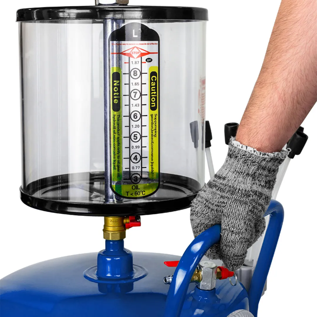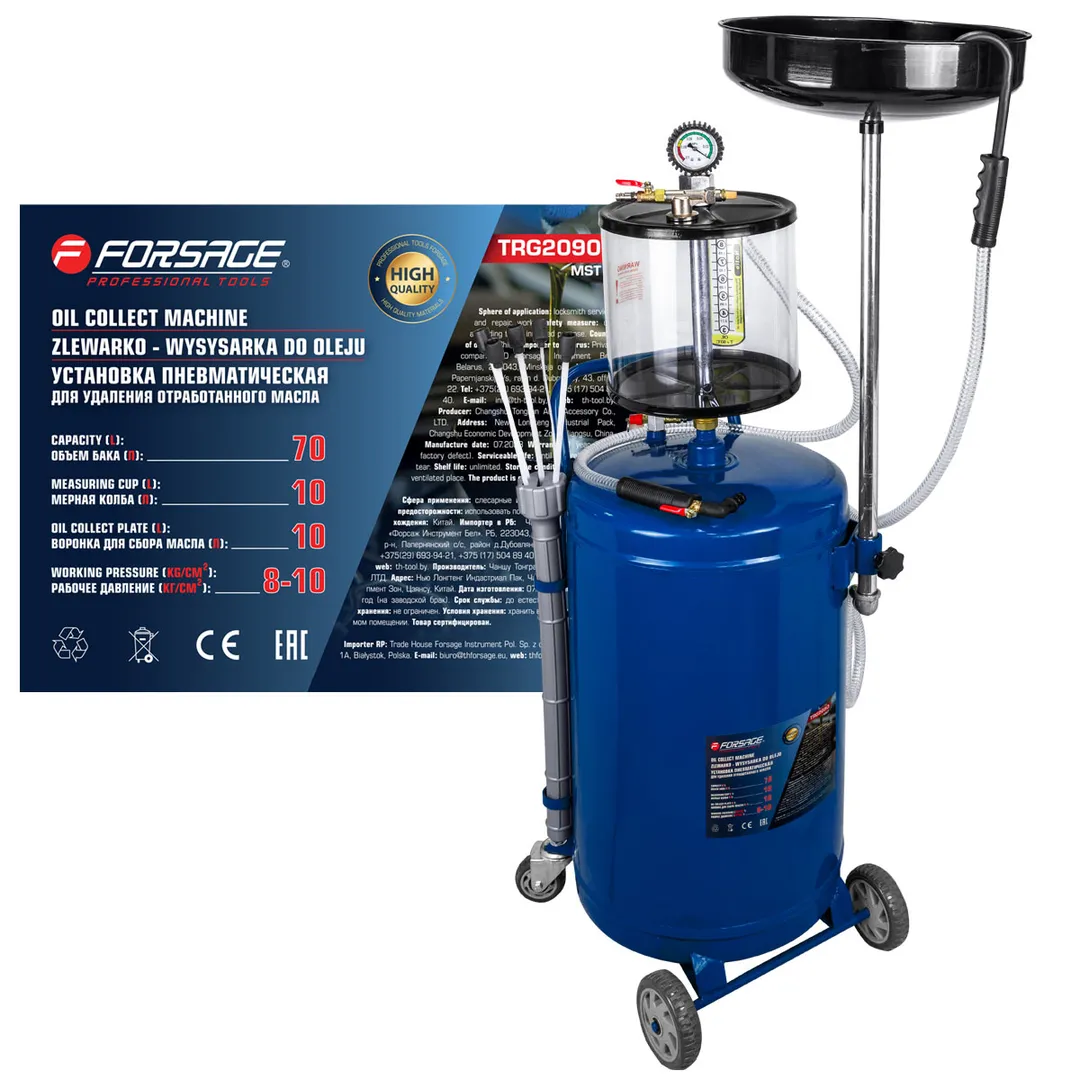 Пневматическая установка для сбора масла 70 л предназначена для удаления отработанного масла и других жидкостей из любого транспортного средства при помощи вентури-вакуумной вытяжной системы или свободным сливом. Используется как сливное устройство со свободным сливом отработанного масла из двигателей, коробок передач и дифференциалов всех транспортных средств. Установка портативна и проста в эксплуатации. Включает 5 гибких щупов для извлечения жидкости через отверстие щупа контроля уровня масла автомобиля. Регулируемая воронка для сбора масла может быть установлена на необходимой для работы высоте. Оборудование укомплектовано краном в воронке для сбора масла, для контроля состояния сливаемого масла перед началом слива в резервуар. Возможность самоочистки делает работу с устройством чистой и легкой. Осмотровая колба позволяет визуально оценить качество отработанного масла, имеющиеся недостатки двигателя и т.п.