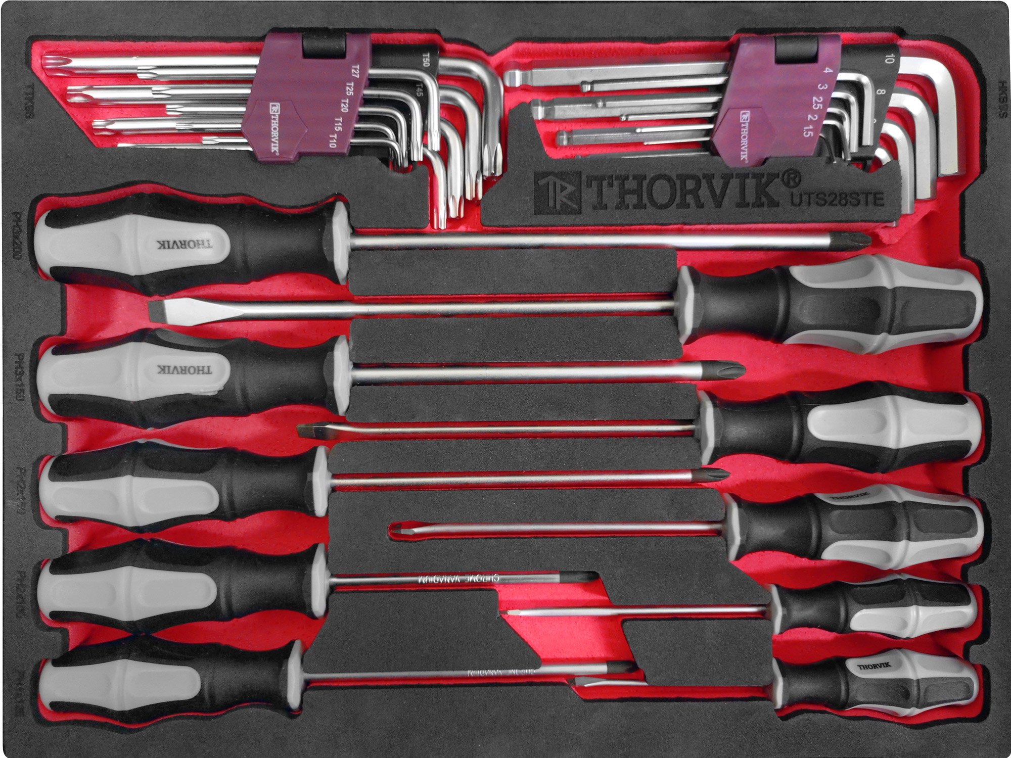Отвертки Thorvik снабжены оригинальными композитными бензомаслостойкими рукоятками, обеспечивающими надежный захват инструмента при работе, благодаря правильному сочетанию мягкой и твердой частей элемента. Стержни, закрепленные в рукоятке с особой прочностью. Рабочие части закалены до высокой твердости и намагничены. При производстве ложементов Thorvik используется двухкомпонентный материал с плотностью по Шору 40А.