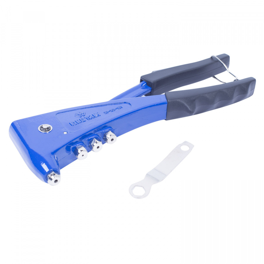 >Заклёпочник оснащён зажимными губками из твёрдосплавной стали. адаптерами для заклёпок разного диаметра. специальным ключом. эргономичными рукоятками из резинопластика.