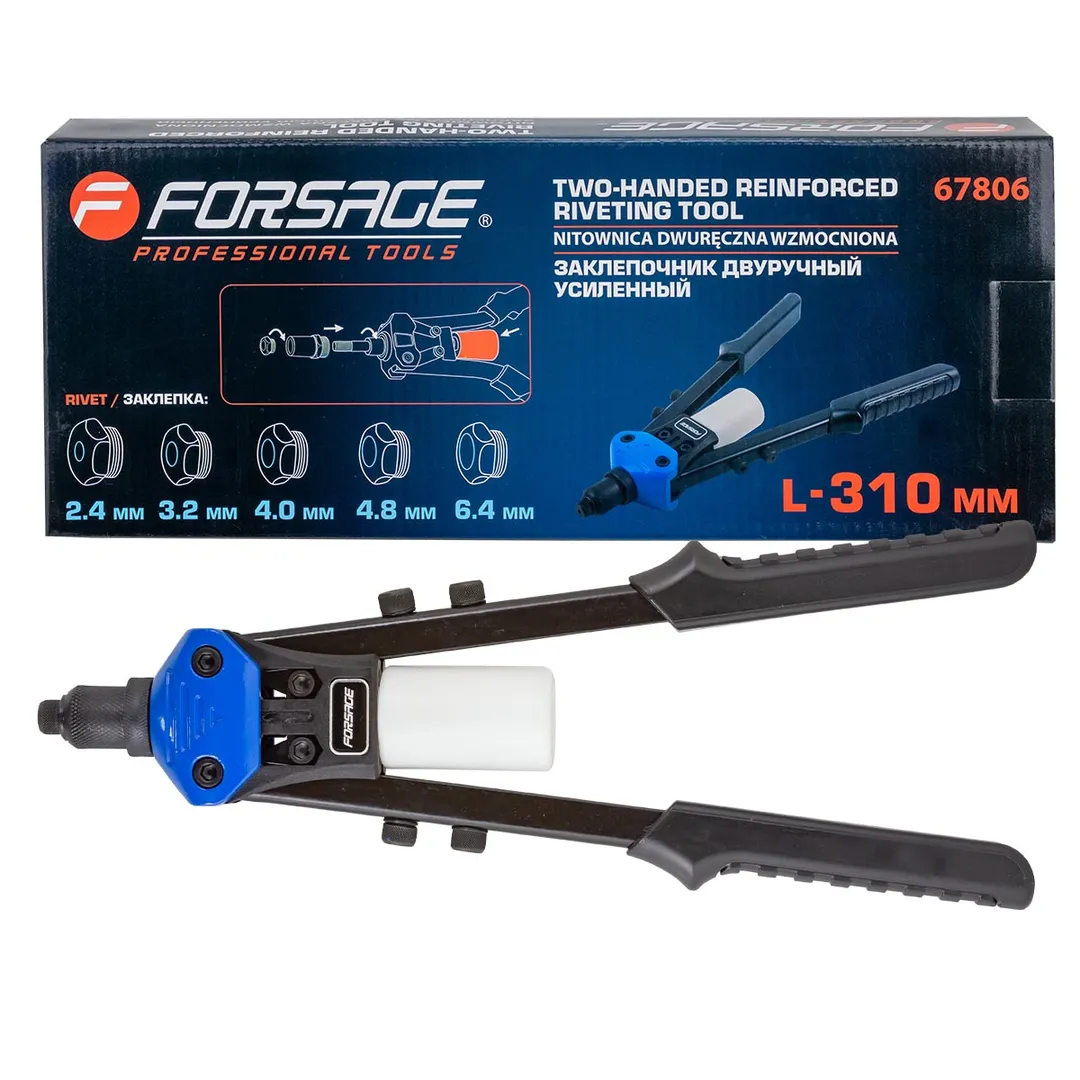 Заклепочник двуручный механический - это инструмент рычажного типа, позволяющий соединять металлические элементы общей толщиной до 10 мм в условиях, когда использование сварки и резьбового крепежа технически невозможно или неэффективно. Соединение осуществляется методом сквозного монтажа крепежного элемента – заклепки.Клепочник вытяжной захватывает стержень и тянет его, формируя закрывающую головку. Изготовлен из литого стального корпуса, на рукоятке резиновые профилированные накладки для комфортного удержания. Заклепочник имеет подвижные длиные прочные ручки, на которых предусмотрены посадочные места для хранения переходников для заклёпок. Между ручками размещён контеёнер для сбора обломанных стержней. Предназначен для соединения между собой различных листовых материалов из металла, дерева, плотных тканей и других материалов.