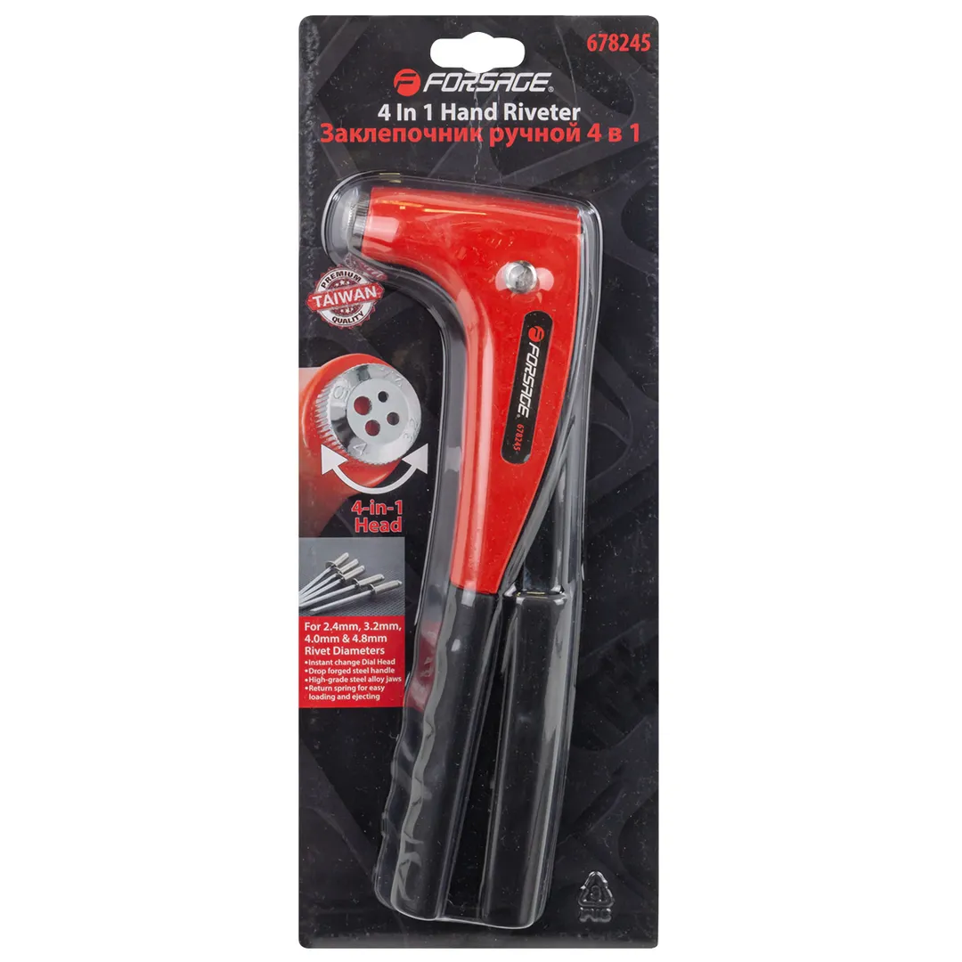 Заклепочник ручной 4 в 1 механический в блистере - это инструмент рычажного типа, позволяющий соединять металлические элементы общей толщиной до 10 мм в условиях, когда использование сварки и резьбового крепежа технически невозможно или неэффективно. Соединение осуществляется методом сквозного монтажа крепежного элемента – заклепки. Заклепочник вытяжной, оснащен поворотной насадкой для заклепок диаметром 2.4 мм, 3.2 мм, 4.0 мм, 4.8 мм. захватывает стержень и тянет его, формируя закрывающую головку. Изготовлен из литого стального корпуса длиной 245 мм, на рукоятке резиновые профилированные накладки для комфортного удержания, что обеспечивает снижение давления на ладонь. Укомплектован универсальной поворотной насадкой для установки заклёпок. Чтобы установить ее в нужное положение, достаточно повернуть против часовой стрелки. Для безопасного использования имеется упор на рукоятке, не дающий прищемить пальцы.