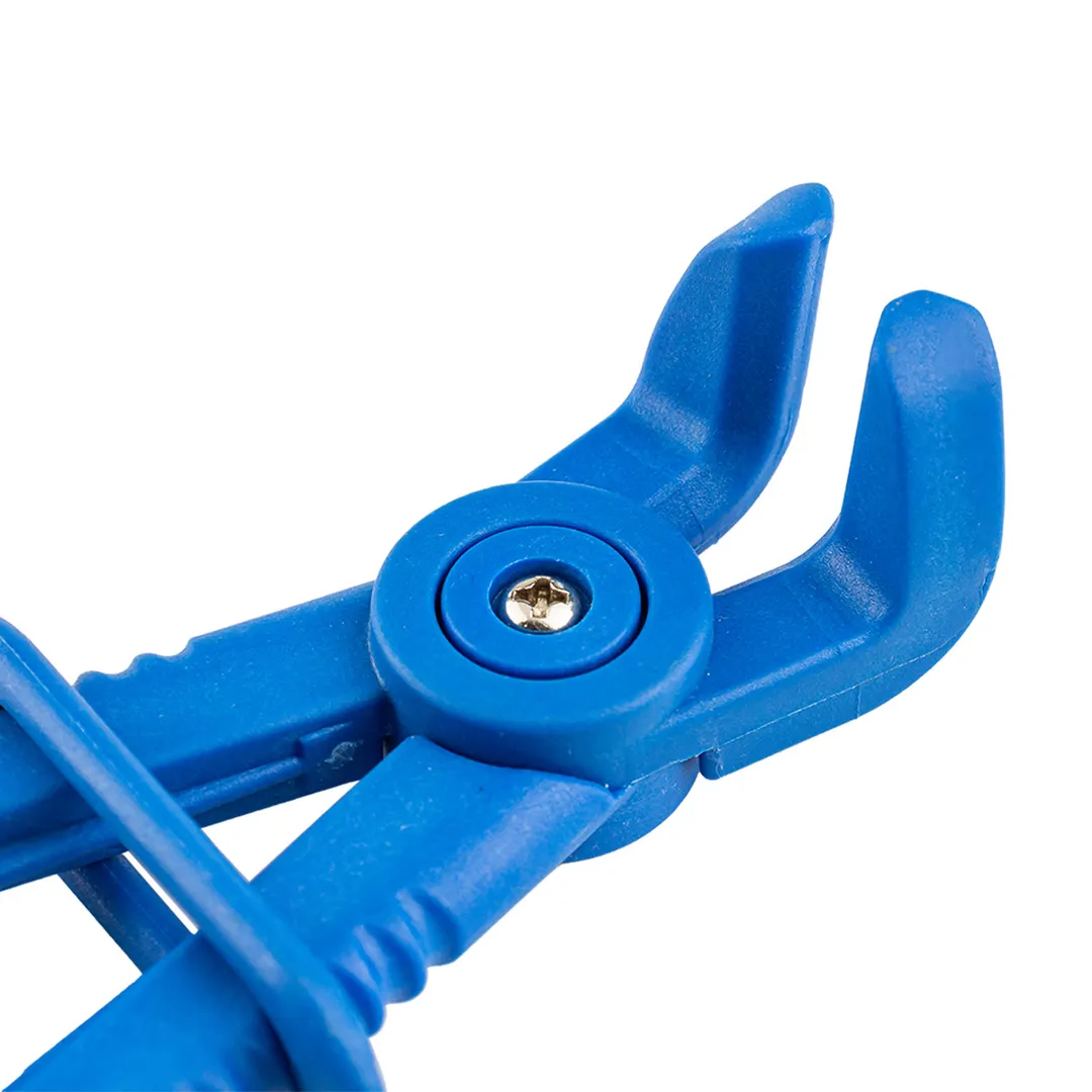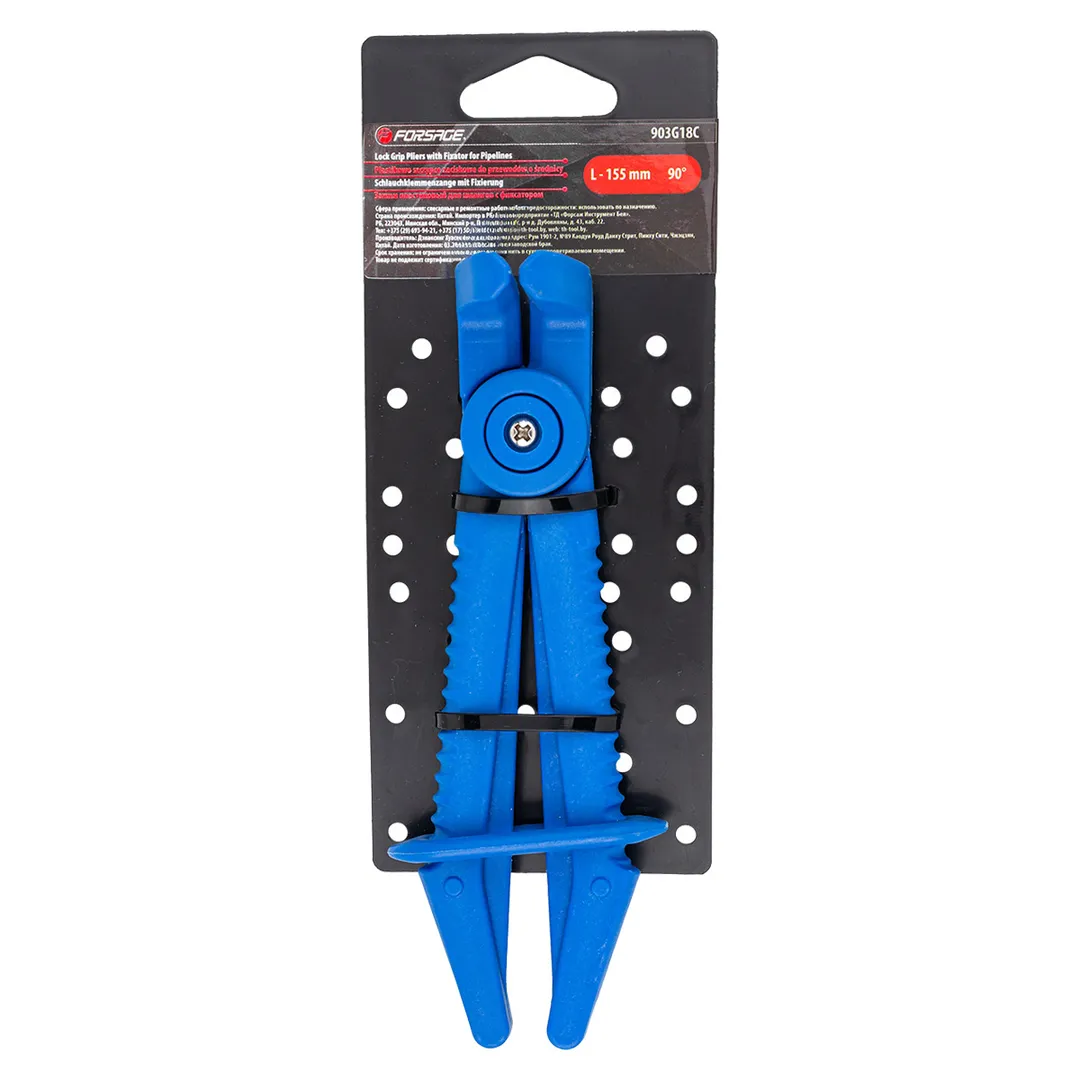 Зажим пластиковый для шлангов с фиксатором изогнутый 90° (L-155мм), на пластиковом держателе используется при ремонтных работах для пережатия шлангов тормозной и топливной систем, системы охлаждения и ГУР. Инструмент обеспечивает надёжное сжатие шлангов без их повреждений. Фиксатор на ручке позволяет зафиксировать зажим на шланге в зажатом состоянии. Зажимы выполнены из прочного нейлона, что гарантирует долгий срок их службы. Закруглённый рабочий профиль зажимных губок исключает повреждение шланга.